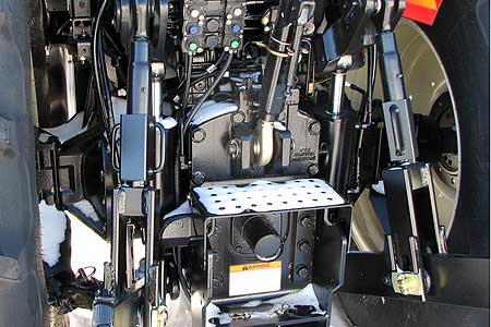 - Трехточечная навеска категории III совместно с тяговым брусом позволяет работать со всеми типами орудий: прицепными, навесными и полунавесными.