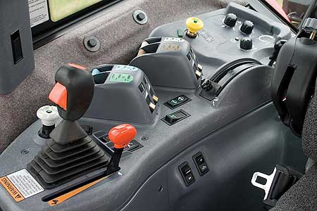 Боковая панель управления может двигаться вперед и назад, так что все основные контрольные элементы регулировки скорости, газа, гидравлики и 3-х точечной навески будут всегда под рукой.